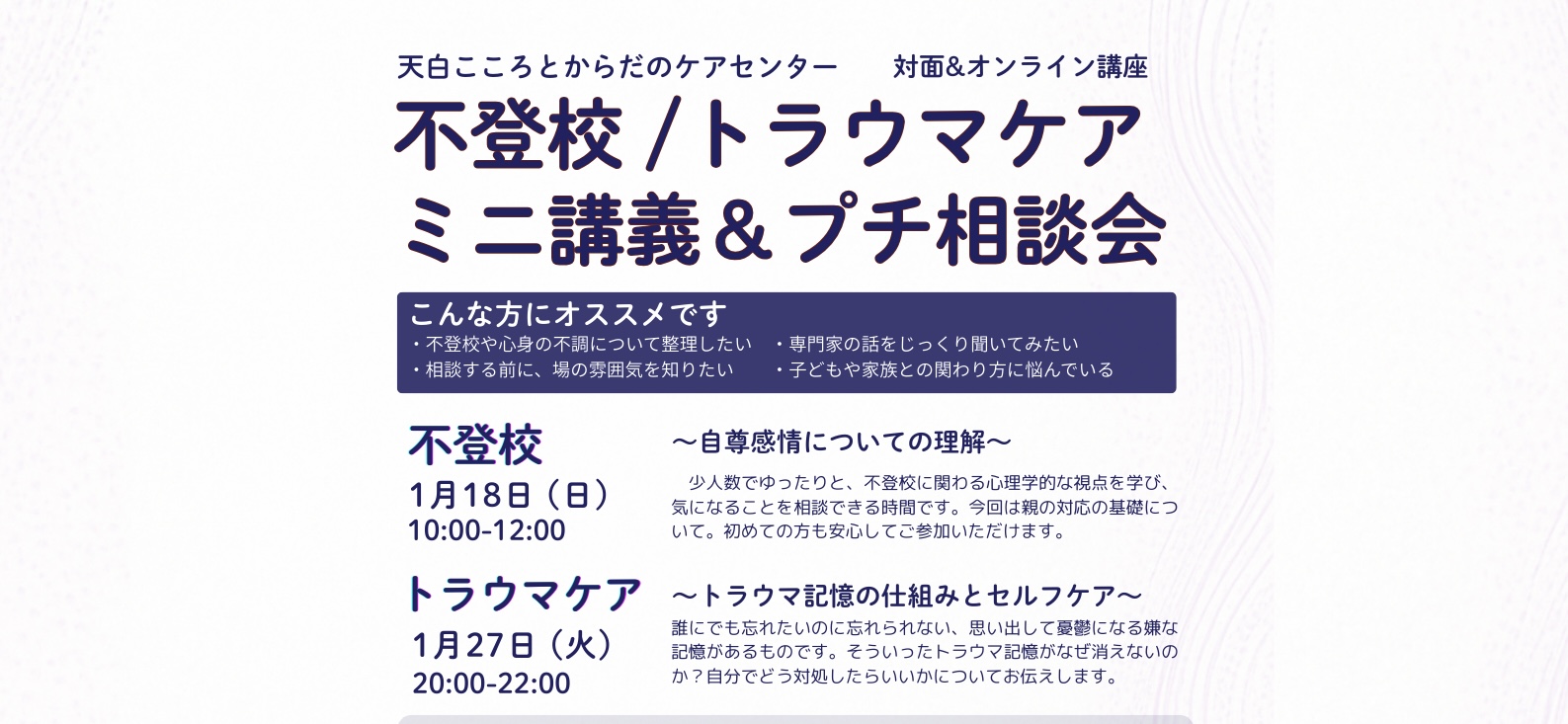 ホーム天白こころとからだのケアセンター 「 天白こころとからだのケアセンター 」 一覧 対面/オンライン講座 2026/01/06 不登校、トラウマに関する勉強会&プチ相談会のご案内 この記事を読む オンラインスーパービジョン無料体験 カウンセリングが上手くなりたい! ケースの見通しをちゃんと立てたい! 手詰まりを感じている! まだまだ上達していきたいカウンセラーの皆さんに、オンラインスーパービジョン無料体験のお知らせです。 毎月3名限定でオンラインスーパービジョンの無料体験をZoomにて行っております。 気になる方は下記のスイッチをクリック! 体験オンラインスーパービジョン